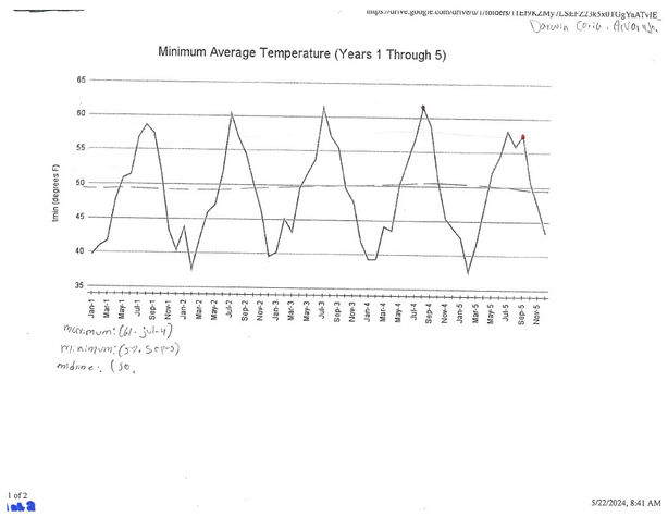Content Understanding Goal: For a periodic function that models a relationship between time and minimum daily temperature in Pala, students will be able to interpret and annotate key features including relative maximums and minimums, periodicity, and midline to support understanding how rising temperatures connect to the environmental injustices affecting the Pala Band of Mission Indians.